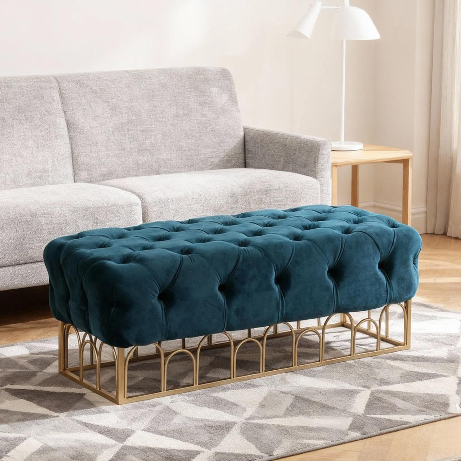 Beautiful tufted velvet bench with gold metal base in sea bllue 125cm length