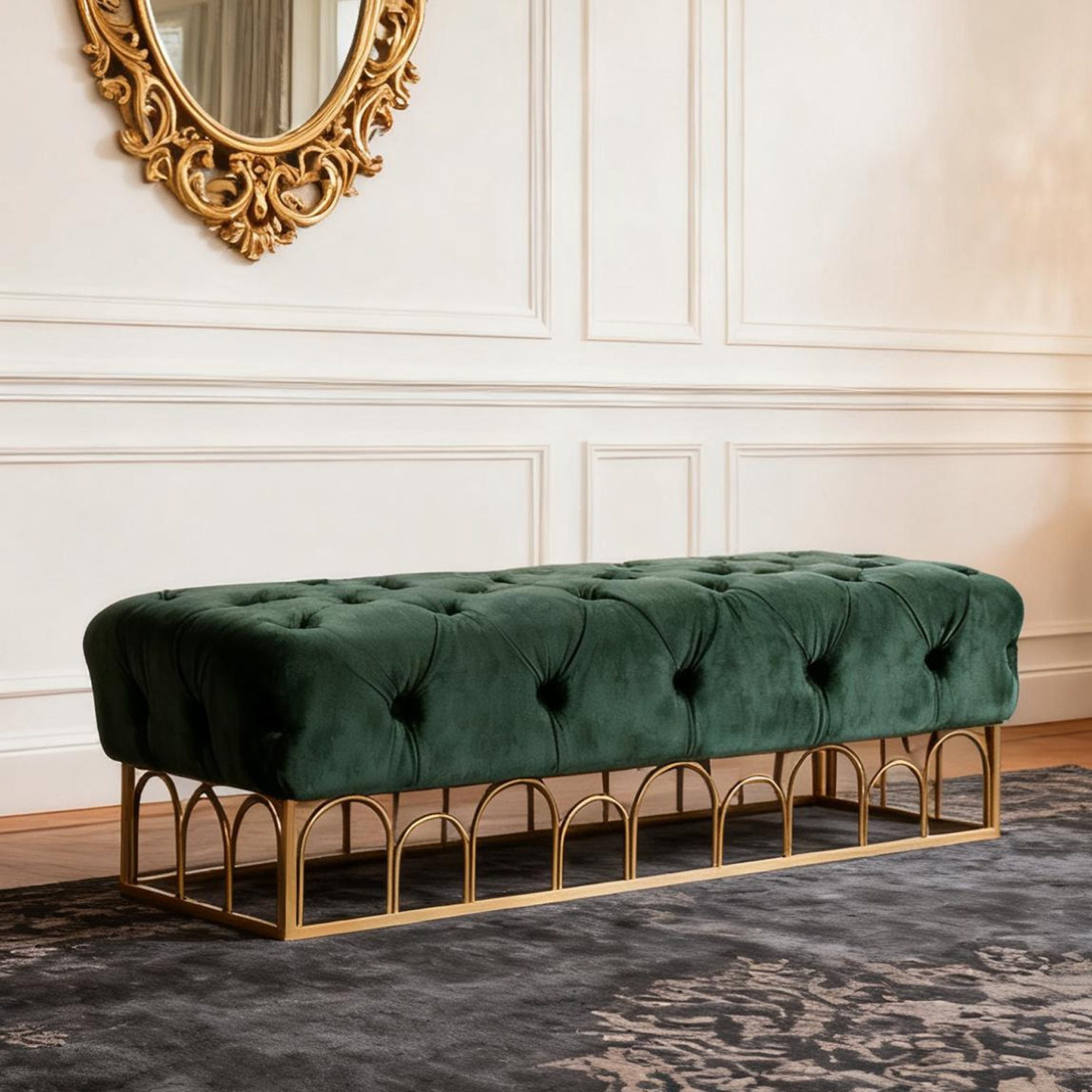 Beautiful tufted velvet bench with gold metal base125cm length-Emerald green