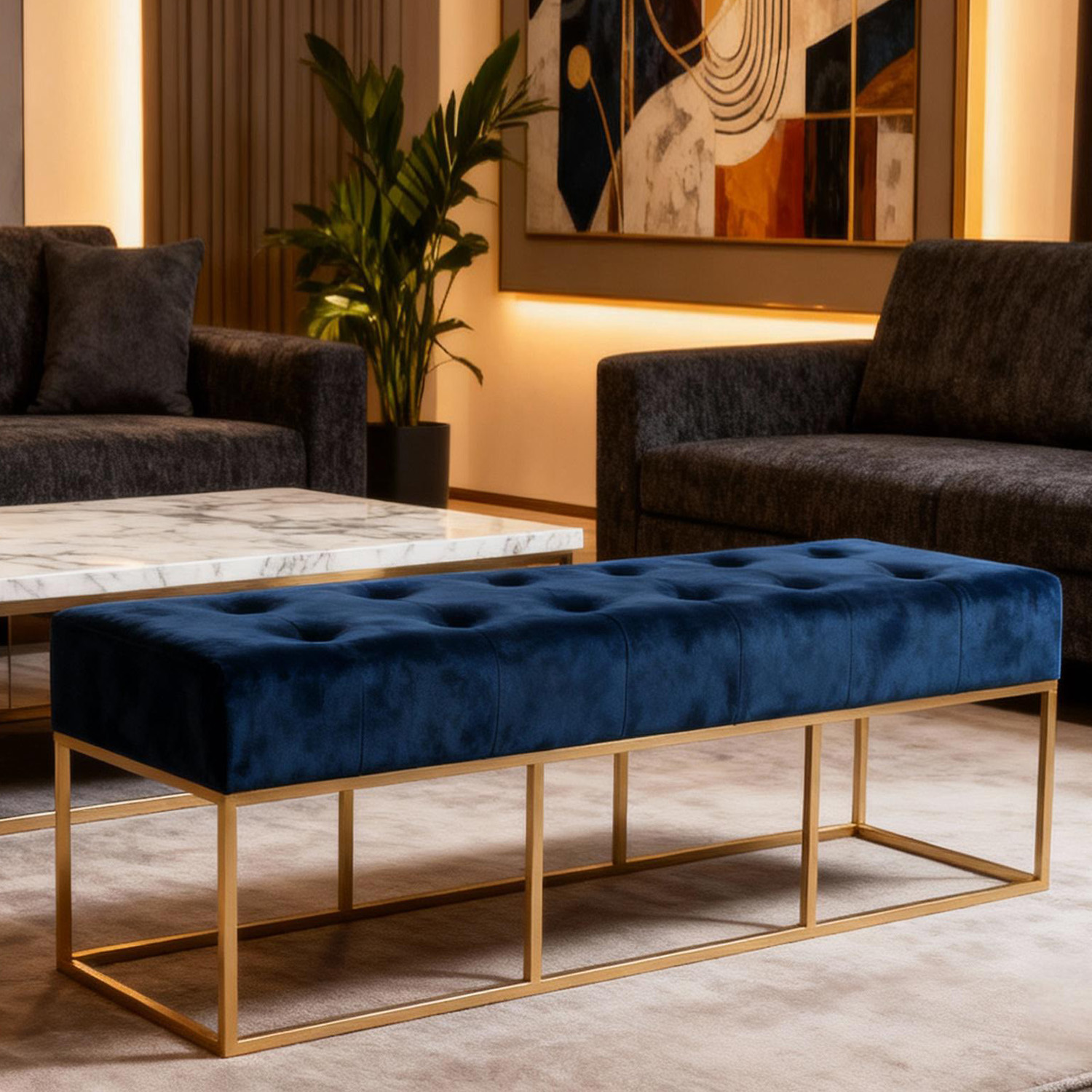 Handmade Bed end Velvet Long Bench with metal gold Base 137cm-Navy blue